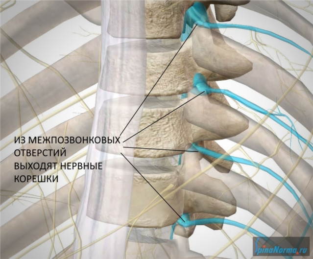 От спинного мозга отходит 31 пара нервных корешков. Из позвоночного канала нервные корешки выходят через межпозвонковые отверстия, которые образуются ножками и суставными отростками соседних позвонков.