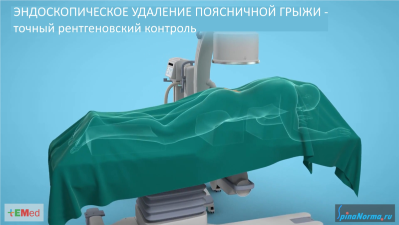 ЭНДОСКОПИЧЕСКОЕ УДАЛЕНИЕ ПОЯСНИЧНОЙ МЕЖПОЗВОНКОВОЙ ГРЫЖИ — это современный способ избавления от грыжевого выпячивания диска, которое сдавливаент нервный корешок. Рентгеновский контроль во время операции позволяет точно «выйти» на грыжу и удалить ее минимально инвазивным, то есть малотравматичным путем.