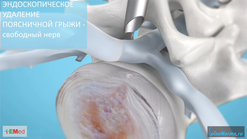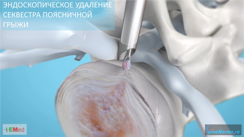 Тонкий спинальный эндоскоп вводится под рентгеновским контролем в позвоночный канал, что позволяет под контролем зрения увидеть сдавленный нервный корешок и полностью удалить грыжевой секвестр.
