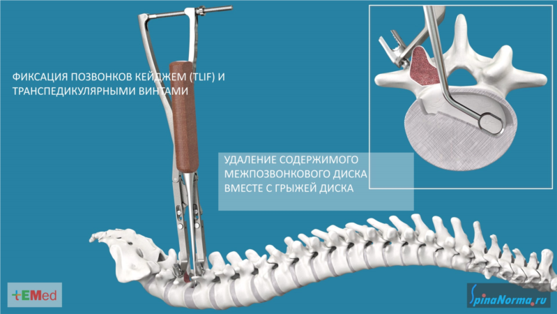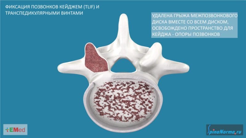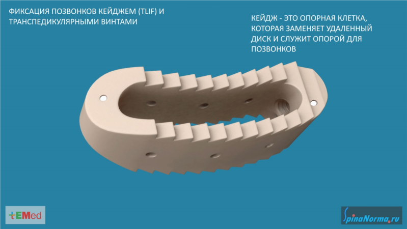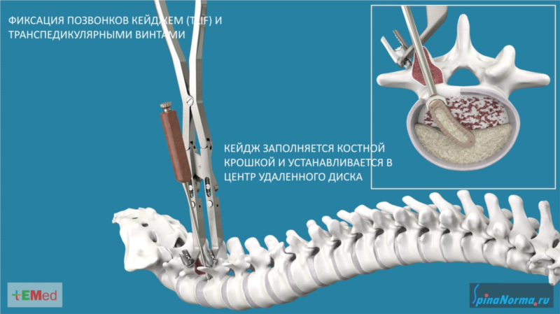 После удаления диска кейдж устанавливается в диск после небольшого разведения позвонков. Это прочно фиксирует кейдж и создает условия для их срастания.