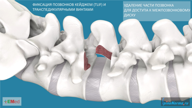 Иногда позвонки смещаются относительно друг друга больше, чем в норме и это вызывает боли и и сдавливание нервов. Это согстояние называется нестабильностью позвоночного сегмента. Нестабильность может приводить к смещению или соскальзыванию позвонка — спондилолистезу. В случаях нестабильности позвонков кроме удаления грыжи диска или расширения позвоночного канала требуется фиксировать излишне подвижные позвонки. Наиболее надежный способ — это фиксация их с помощью кейджа и транспедикулярных винтов. Такой способ получил название TLIF, от английского transforaminal lumbar interbody fusion.
