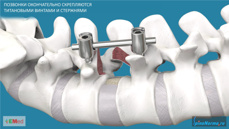 Завершается операция окончательным скреплением титановых винтов и стержней, которые прочно удерживают позвонки. Таким образом ликвидируется патологическая подвижность, нестабильность. Позвонки сразу после операции надежно фиксированы, что позволяет пациенту через несколько часов после операции ходить и сидеть. Пожизненное срастание позвонков происходит в течение 4-6 месяцев, когда наступает костное сращение позвонков — спондилодез.