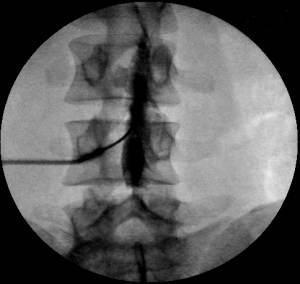 Для того, чтобы окончательно убедиться в правильности нахождения иглы в перидуральном пространстве вводится небольшое количество рентгенконтрастного вещества.