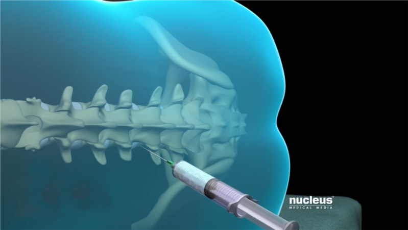 Далее доктор под рентгеновским контролем аккуратно проводит иглу между дужками позвонка, ориентируясь на сопротивление тканей. Как только кончик иглы попадает в перидуральное пространство появляется ощущение потери сопротивления тканей.