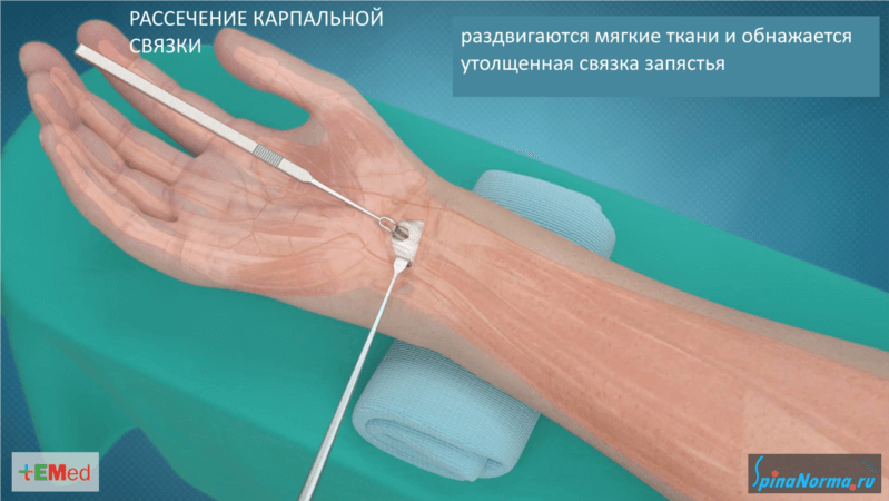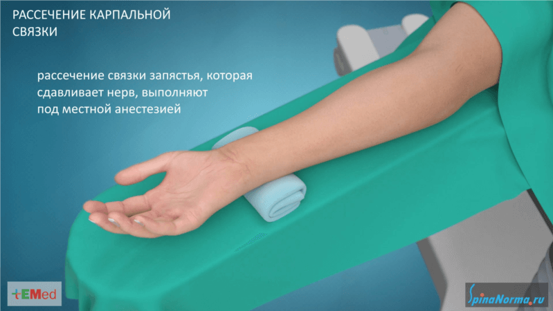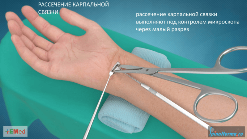 При неэффективном консервативном лечении карпальной невропатии в результате утолщения связки выполняют ее минимально инвазивное рассечение. Нейрохирург выполняет такое вмешательство под контролем микроскопа под местной анестезией.