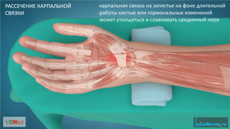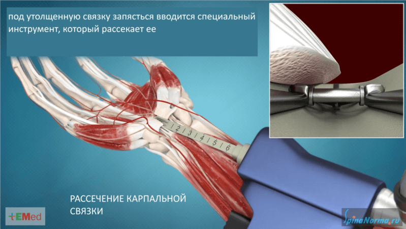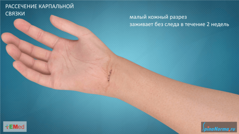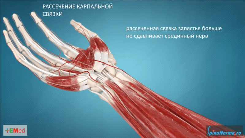 Рассеченная связка запястья перестает сдавливать срединный нерв. Это ликвидирует мучительные боли и онемение в руке у пациентов, особенно беспокоящие их в ночное время.
