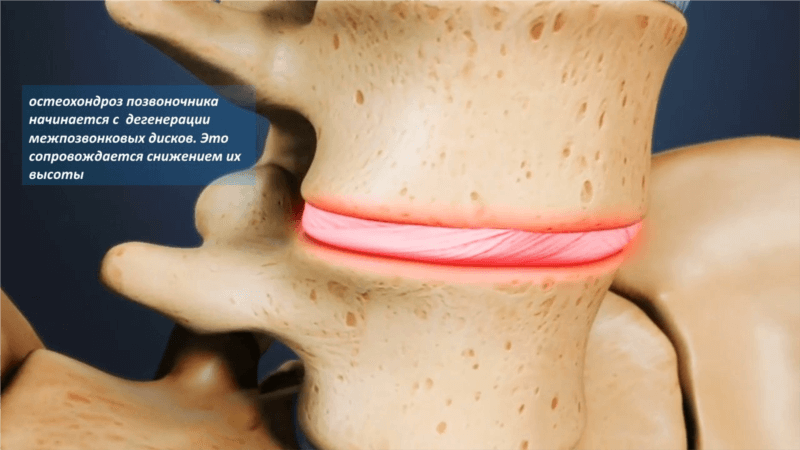 Остеохондроз позвоночника (спондилез, дегенеративная болезнь межпозвонковых дисков) начинается с дегенерации межпозвонковых дисков: уменьшении содержания воды в пульпозном ядре, снижении их высоты, появления трещин в фиброзном кольце.