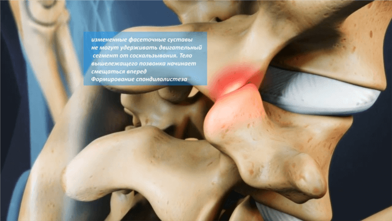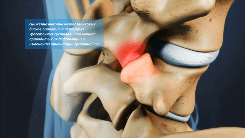 Снижение высоты межпозвонковых дисков приводит к хронической перегрузке фасеточных суставов, что может приводить к их деформации. В результате фасеточные суставы не могут удерживать позвонковый сегмент.
