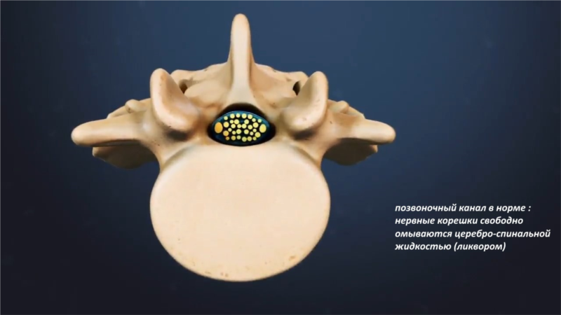 В стенозированном позвоночном канале нервные корешки находятся в состоянии хронической гипоксии (кислородного голодания). Гипоксия нервных корешков сопровождается болью в нижних конечностях, а также нарушениями неврологических функций (снижение чувствительности в ногах, мышечная слабость в ногах).