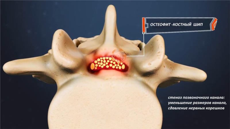 - развитие остеофитов — костных шипов, которые могут сдавливать нервные корешки