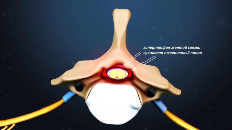 - Гипертрофия желтой связки. Желтая связка соединяет сзади дужки позвонков. В некоторых случаях, особенно при хронической нестабильности двигательных сегментов позвоночного столба отмечается ее гипертрофия. У части пациентов утолщенная желтая связка может пролабировать в позвоночный канал, вызывая его стенозирование.