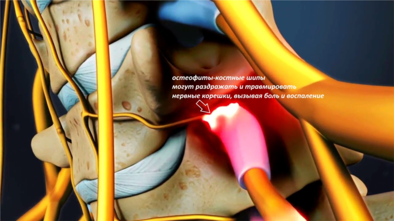 - Развитие остеофитов — костных шипов, которые могут сдавливать нервные корешки особенно в латеральных каналах и фораминарных отверстиях. Это приводит к хроническому раздражению нервного корешка, его морфологической перестройке, что сопровождается болью в руке, снижением чувствительности, а в тяжелых случаях слабостью мышц пораженной поверхности.