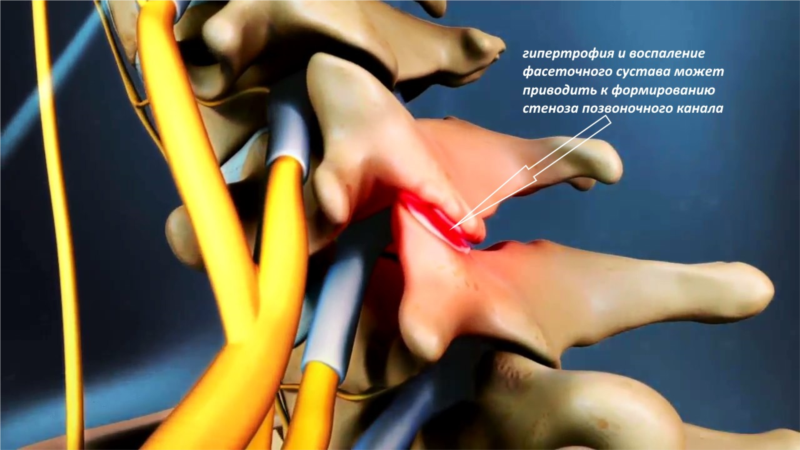 - Гипертрофия фасеточных (дуго-отросчатых) суставов развивается при остеоартрите (фасет-синдроме). Увеличение фасеточных суставов является частой причиной развития стеноза позвоночного канала