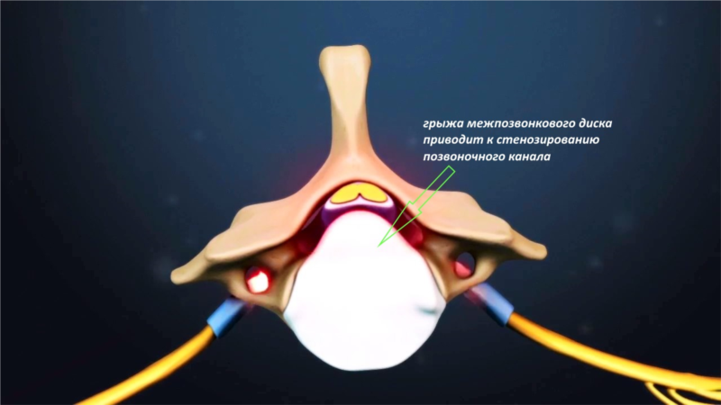 - Протрузии и грыжи межпозвонковых дисков могут приводить к уменьшению размеров позвоночного канала и развитию стеноза. В тяжелых случаях развивается сдавление невральных структур с формированием характерной клинической картины.
