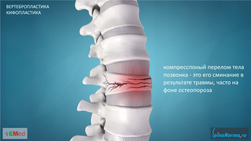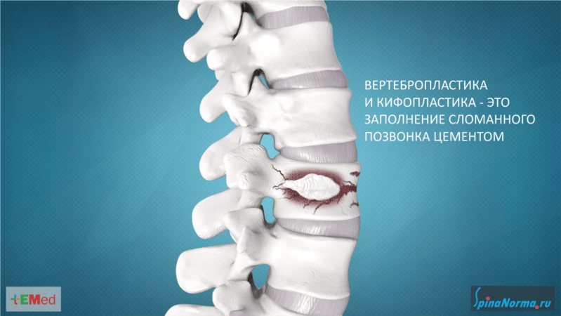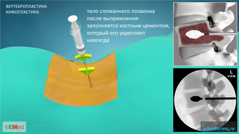 Современный метод лечения компрессионных переломов позвонка и у молодых, и у пожилых пациентов — заполнение его цементом, что получило название ВЕРТЕБРОПЛАСТИКА. Если в ходе процедуры производится выпрямление сломанного позвонка, то процедура называется КИФОПЛАСТИКА. При больших ГЕМАНГИМОМАХ тела позвонка также выполняется вертебропластика, при которой цемент заполняет клубок сосудов, что ликвидирует боль, останавливает рост опухоли и предотвращает возможный перелом позвонка на фоне гемангиомы.