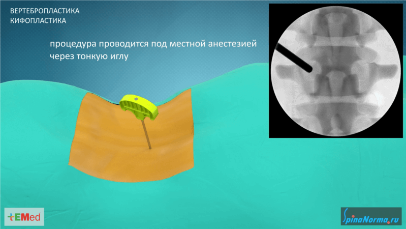 Вертебропластика и кифопластика проводятся под местной анестезией через прокол иглой. Контакт пациента и врача во время операции, а также рентгеновский контроль позволяет это делать абсолютно безопасно для нервных корешков и спинного мозга.