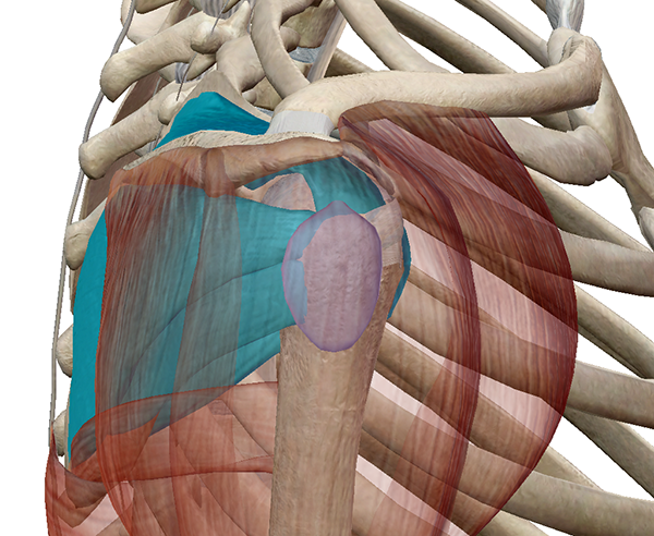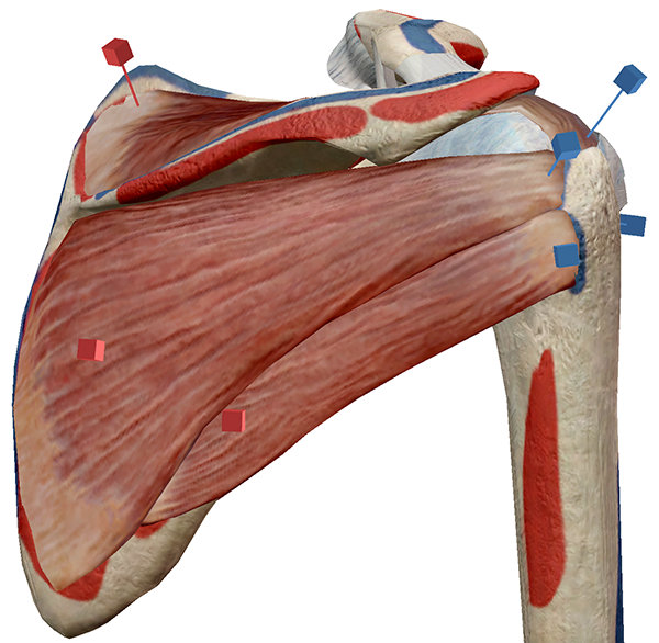 Все эти мышцы начинаются от лопатки и прикрепляются к плечевой кости. На этом рисунке место начала мышц помечено красными квадратами, а места их прикрепления — синими квадратами.